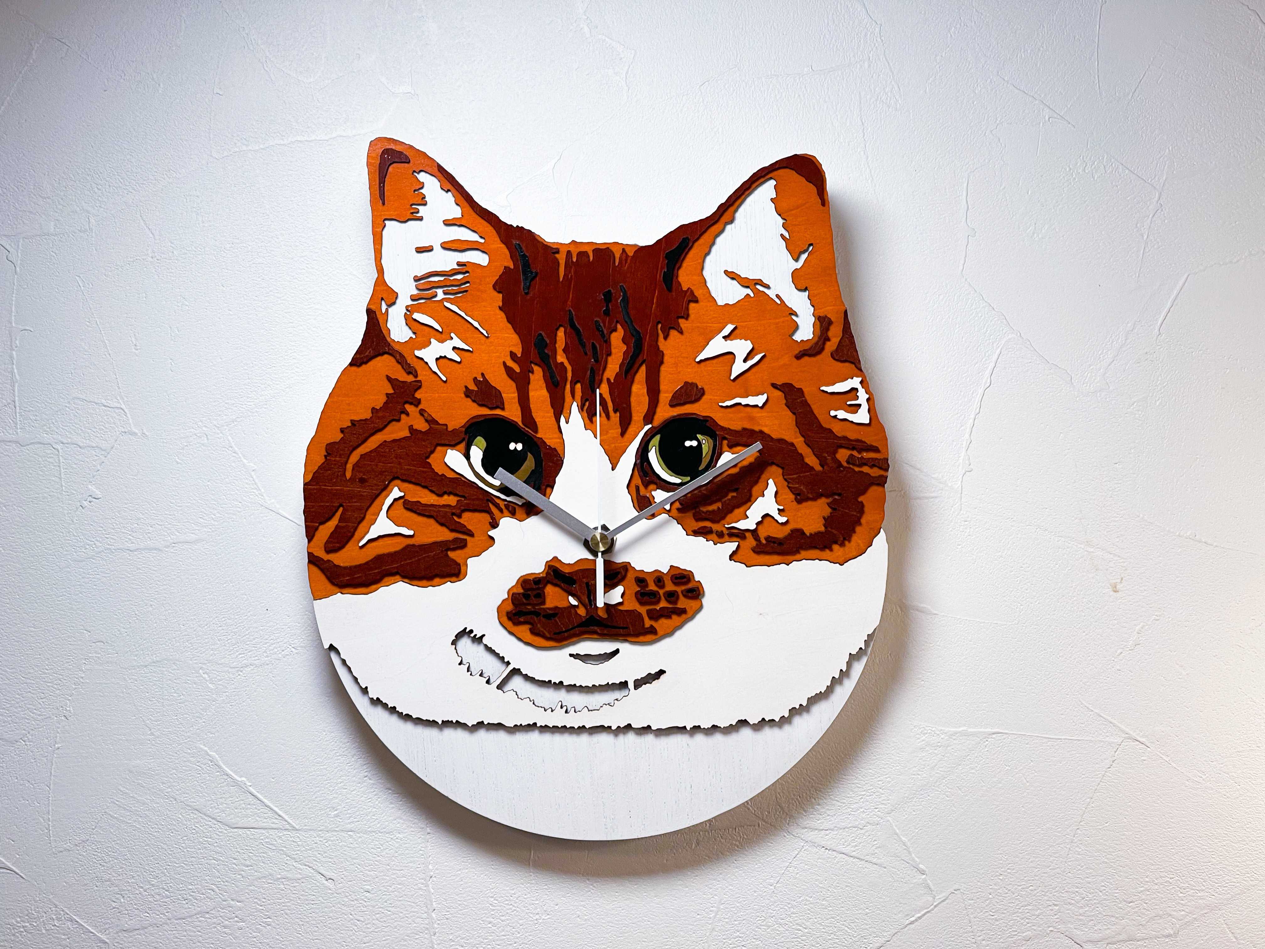 デザインについて 可愛いリアル系猫の顔の壁掛け時計です。 時計を見るたびに癒されて欲しいという想いで製作しました。 にゃんこの顔を飾る事でご家庭のリビングや店舗などインテリアにちょっとしたアクセントを与えてくれます。 色違いの木板を重ねて半立体的に描かれたニャンコの顔は お部屋の照明によって独特の陰影がニャンコの顔のイラストに深みをもたらします。 〜〜〜〜〜〜〜〜〜〜〜〜〜〜〜〜〜〜〜〜〜〜〜〜〜〜 機能について ムーブメントはセイコークロック社のクォーツムーブメントを採用。秒針はカチカチ音がないスイーブタイプで滑らかに動き静かに秒を刻みます。 背面のフック掛けはムーブメント本体とパネルで高さを2段階で調整できます。 製品ひとつひとつにはロットナンバーとシリアルナンバーが刻印されています。 〜〜〜〜〜〜〜〜〜〜〜〜〜〜〜〜〜〜〜〜〜〜〜〜〜〜 製作について 土台部分は手作業で削り出し、塗装、コーティング、磨き加工を行っています。 にゃんこの顔は木板の状態で塗装、コーティング、磨き加工を行ってからレーザー加工でパーツを切り出しています。 切り出し後、木口の焼き色を残しつつ加工時に表面に付着する煤を丁寧に取り除いてから組み立てを行っています。 この様な工程を踏む事で、独特なメリハリのある絵柄を表現しています。 〜〜〜〜〜〜〜〜〜〜〜〜〜〜〜〜〜〜〜〜〜〜〜〜〜〜 品切れの際はプロフィールの質問・オーダーの相談より制作リクエストをお送りください。 制作には1〜2ヶ月間ほどかかります。 〜〜〜〜〜〜〜〜〜〜〜〜〜〜〜〜〜〜〜〜〜〜〜〜〜〜 サイズ 幅25cm 高さ30cm 厚み約3.5cm(針を含む) 材質:シナ材 ムーブメント:セイコークロック社 <SKP>クォーツムーブメント スイーブ式 付属品 作動確認用単三電池 一本 〜〜〜〜〜〜〜〜〜〜〜〜〜〜〜〜〜〜〜〜〜〜〜〜〜〜 天然素材及び手作業で組み立てているため一点一点、木目・色味・組み付けが若干異なる場合がございます。 予めご了承ください。 カバーはありませんので時計の針の変形・破損には十分お気をつけください。 |